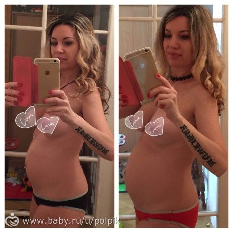 Очень аккуратный животик, не большой для твоего срока. У меня с дочкой был огромный, а родила на 3110 кг. Плод прикрепился к передней стенке, поэтому и был большой живот. А с двойней огромный 120 см в обхвате.Я еле передвигалась, в 30 недель весили 1700 г, родились по 3кг каждый. Ты прекрасно выглядишь, фигурка загляденье, сексуальная, только по лицу видно что уже устала. Ребёночек скорее всего активный будет ) Я по своим заметила, кто как вел себя в животике так и после рождения )
