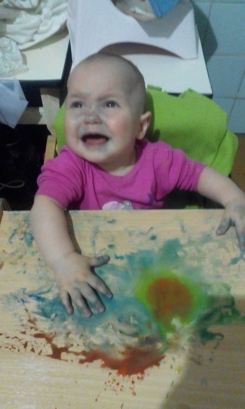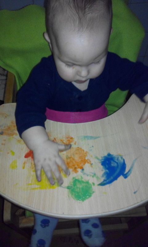 Мы так обычно красками рисуем — я на стол наливаю цветные круги, а она ручками смешивает.