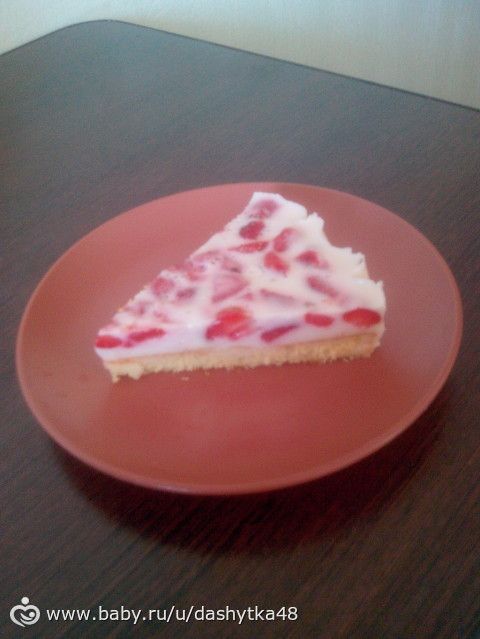 Форму застелить пленкой, выложить корж, сверху выложить клубнику.