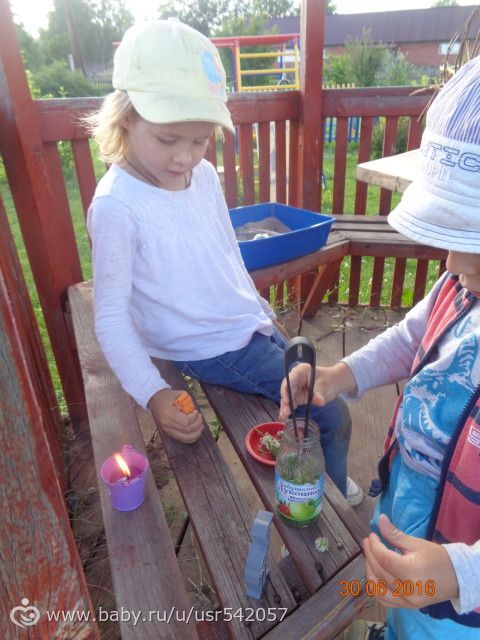 По ходу сказки варили манную кашу. Из чего — дети сами должны были придумать. Из песка сварили))) Окрошку из травы с водой сделали. Лиде конечно хотелось поучавствовать и в приготовлении окрошки, поэтому она быстро нашла решение: сейчас я буду жена журавля! Пока искали ингредиенты для окрошки обратила их внимание, что листики у клевера все трёхлистные. И рассказала, что есть поверие, кто найдет 4-х листный клевер того ждет счастье. Дети поискали немного. Нет говорят такого. «А ты, мама когда такой находила»?,- спрашивает дочь. «Да не находила что то», — говорю. «Не может быть! Как же не находила? А мы тогда у тебя откуда? Вот ты нашла такой клевер и счастье твое пришло — нес родила — ведь мы твое счастье!», — уверенно и на полном серьезе заявила дочь.