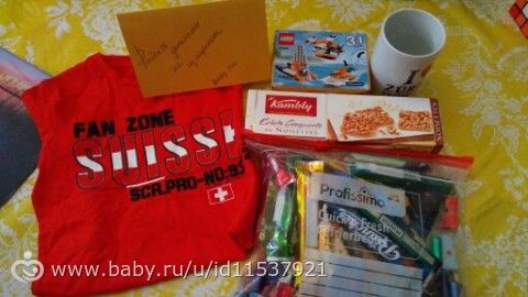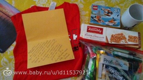 Спасибо моя дорогая! Очень приятно получать сюрпризы! Почти на день варения! Милая открытка стоит на видном месте и радует по утрам! Сладостей много, внук с пакетом не расстаётся ) Футболка идеально подошла! Лего утащил моментально, закусывая по дороге печеньками ) А вот кружечка к сожалению пострадала ( ручка отбитая была). К стати на нашу почту посылочка пришла вскрытая. Свет, глянь, может чего утянули...