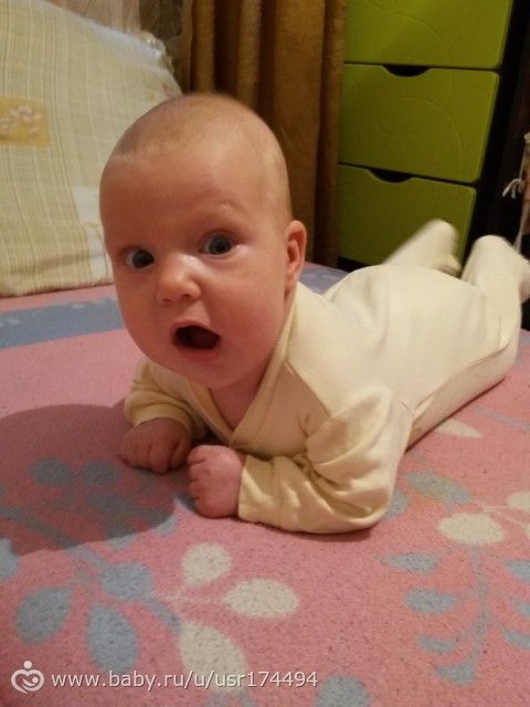 Улыбаемся сейчас тоже всем, возраст видимо такой) переворачиваемся постоянно туда-сюда. Голову очень хорошо держим и на ручки опираемся уверенно. Даже ползать пытаемся, но пока не получается)
