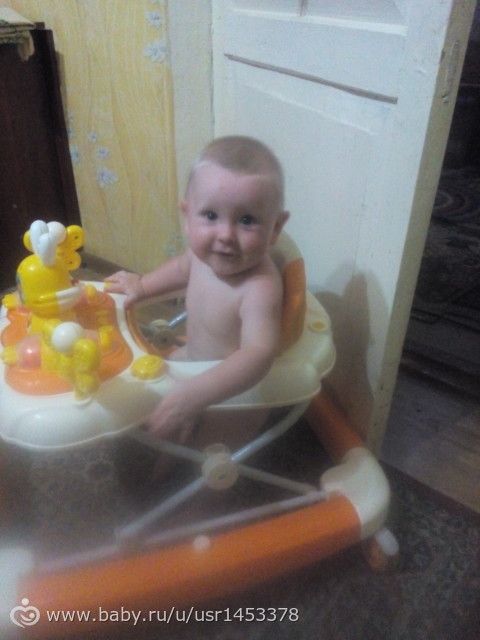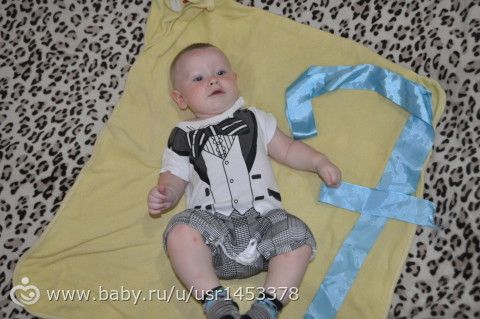 Уже нам 7 месяцев. Мой сынок такой уже большой и такой ещё маленький)))) Прибавил ещё 400 грамм (весим 9200) и вырос на 1 см (рост 71 см). Очень хорошо знает свое имя, а точнее имя и отчество))), мама для него теперь не просто еда, а ещё самая родная и близкая, папа это что то невероятное, когда папа приходит домой, Мирон бросает все и только к папе на ручки, братья -это развлечения, ведь у каждого из братьев для малыша свои игры. Из умелок: сидим с 5месяцев, крутиться в разные стороны, из положения сидя падает на ручки вперёд и стоит на коленях, а ручки пока не переставляет, если что то хочет достать передвигается перекатами. Повторяет разные слоги ма-ма, ба-ба, ба-ма, на-на. Стал очень требовательным. Любит песни и сказки. И сегодня встал сам в кроватке. Кушаем и овощи и фрукты, любит каши и печеньки Бонди.