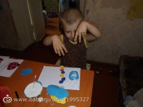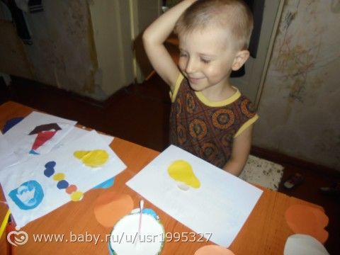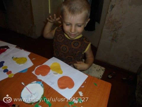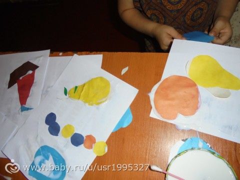 Решили заняться аппликацией. Нарезала разные формы (квадраты, треугольники, кружочки и разные фрукты.