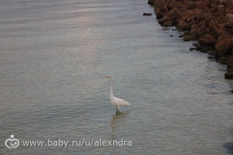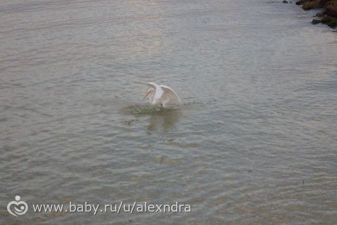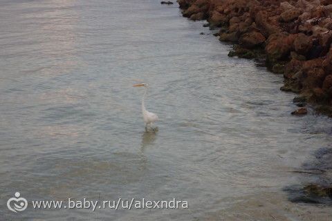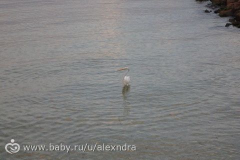 Вот белый журавль охотится за рыбой, сначала он просто задумчиво стоял на камнях, но потом — решился).