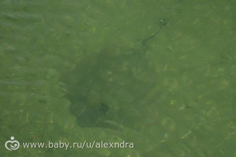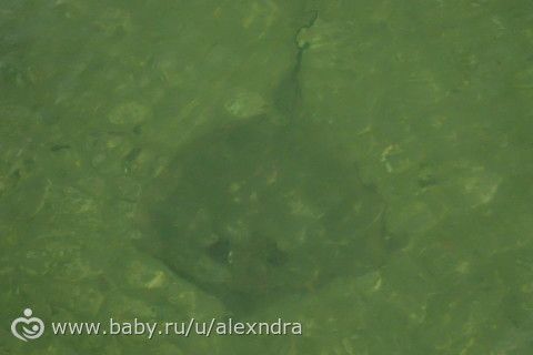По дну на мелководье неспеша передвигаются скаты, размером в полразмаха рук, просто гигантские для меня, через воду получилось сфотографировать.