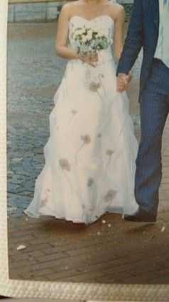 У меня было цвета слоновой кости с коричневыми крупными маками по всему лифу и юбке. Очень необычно, ни у кого ничего подобного не видела