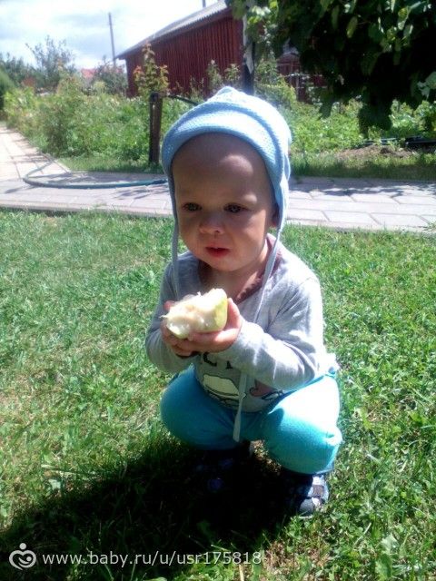 На улице мы часто едим. Яблоки, груши, голубику (уже к сожалению заканчивается), клубнику, арбузы. Никита хочет яблоко или грушу, если не видит их во дворе или беседке, то ведёт туда, где растут. Путь не совсем короткий. Но он упрямо ведёт туда, показывает что и как ему надо.