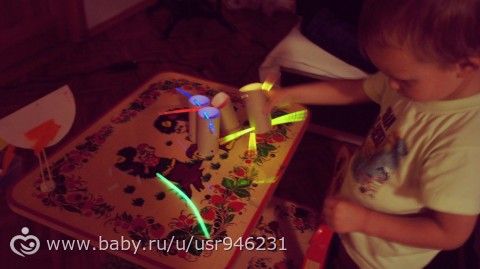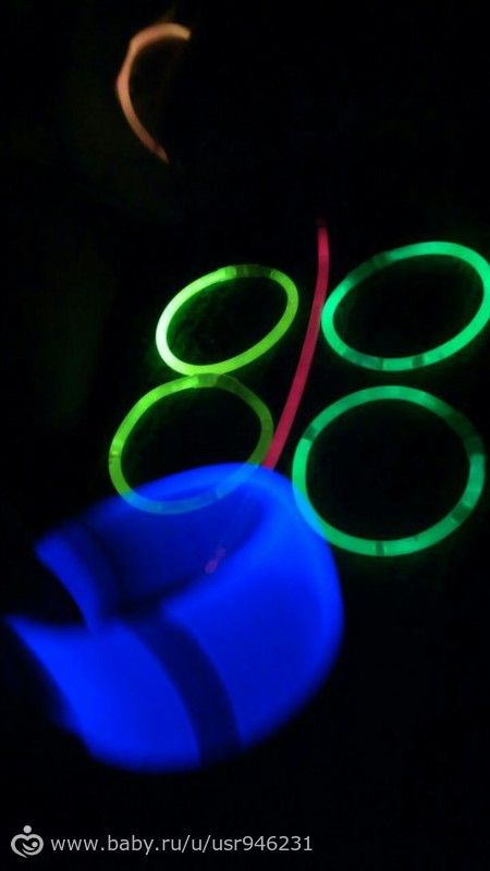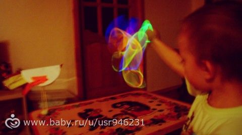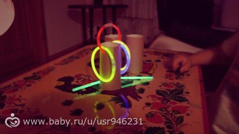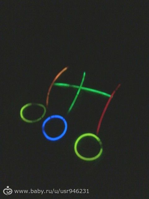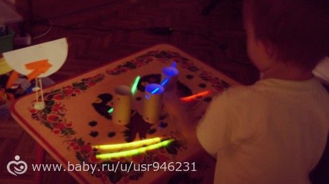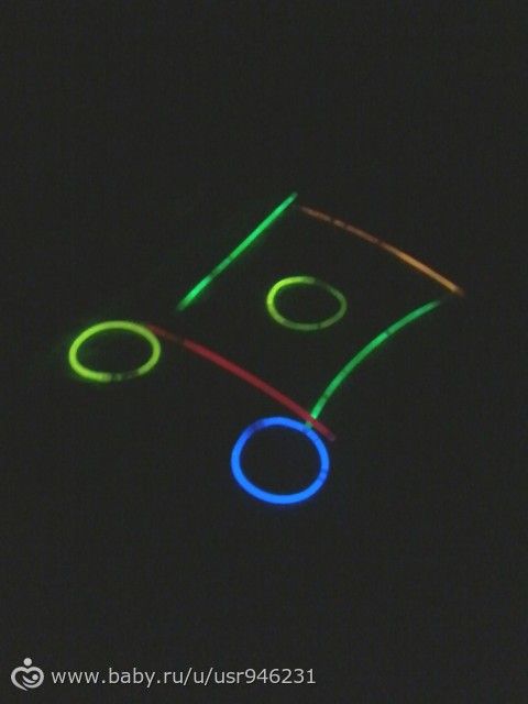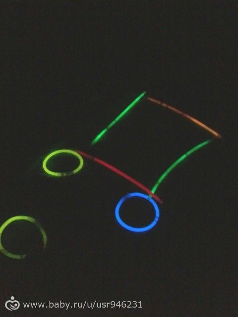 Обожаем светящиеся палочки — столько игр можно с ними придумать: и танцы, и конструктор, и «звездные» мечи, светлячки в банке, звезды в сенсорной коробке… а недавно мы делали фигуры! И ракету, и машину, и робота, и лодку, и бабочку, гроздь винограда… играли минут 30!)) Рекомендуем)