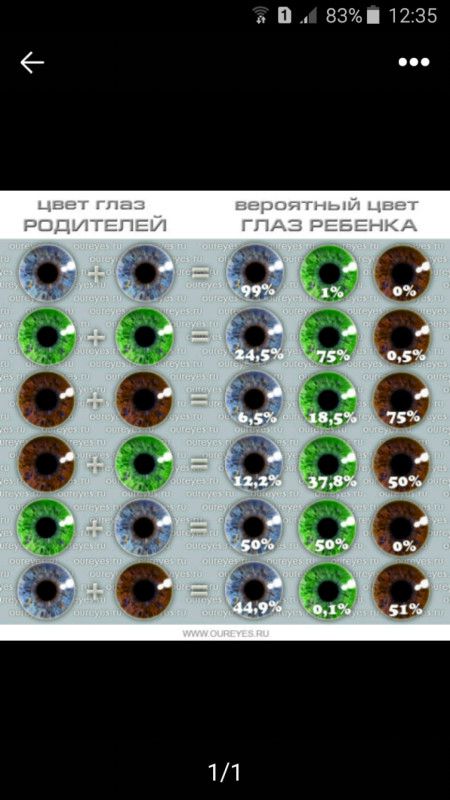 Не правда)))у мужа карие и у всей его родни, у меня серо-голубые, итог дети: старший сын родился с голубыми, сейчас серо-зеленые стали как у моей мамы, у дочки ярко-голубые родилась и до сих пор, третьего родила серо-синие, вот хоть может он возьмёт папины глаза)))