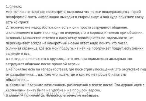 ну тут на вкус и цвет, ко всему новому народ тяжело привыкает) Из всех этих пунктов не очень устраивает только размещение фото (но надеюсь это доработают) А так сайт стал похож на более молодой и прогрессивный. А так боритесь конечно, я и старому порадуюсь))