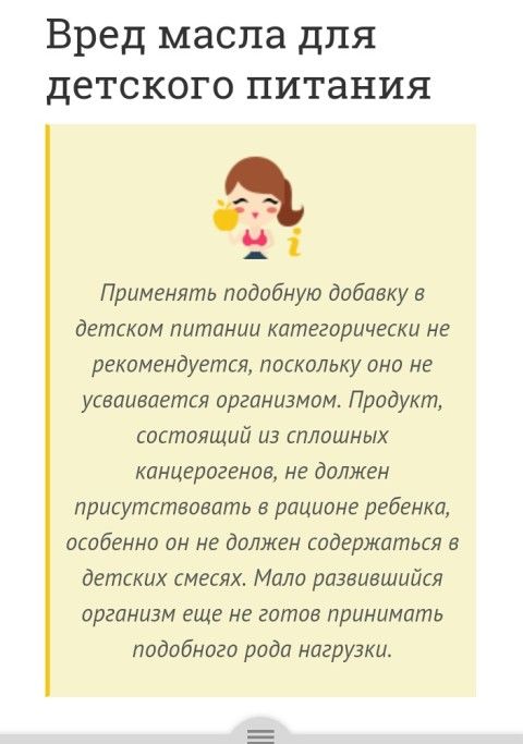 Я же говорю, что в пальмовом масле содержится самый большой процент пальмитиновой кислоты. Она же содержится в грудном молоке. А если в составе его нет, то просто на просто оно заменено на другие масла, которых требуется гораздо больше, чем пальмового. Это сомнительная полезность, согласитесь. А то что на коробках пишут, это маркетинг чистой воды. Потому что кто то когда то услышал, что пальмовое масло вред, а производитель стал это использовать на свою руку. А искать первые попавшиеся статьи в интернете немного неправильно