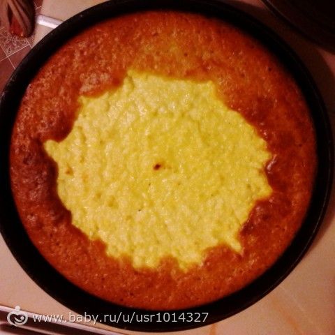Готовый пирог немного остудить в форме. При выпечке «тяжелая» творожная начинка опускается вниз, а бисквит поднимается, образуя бортики.Бисквитное тесто на сметане:
