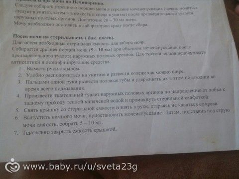 Когда вы получили направление на посев мочи, уточните у доктора, как нужно его сдавать. В этом нет ничего сложного. Вставьте ватный тампон во влагалище. Соберите среднюю порцию именно утренней мочи. Доставьте банку в лабораторию максимум через два часа. Емкость для сбора материала должна быть предельно стерильной. В домашних условиях простерилизовать какую-либо баночку будет очень сложно, поэтому лучше всего купить ее в аптеке. Утром нужно тщательно подмыться с мылом. Чтобы в емкость с мочой не попали бактерии из влагалища, следует ввести в него ватный тампон и только после этого начинать собирать мочу. Лучше всего брать среднюю мочу. Для этого необходимо немного помочиться в унитаз и только после этого набрать небольшое количество материала в емкость.