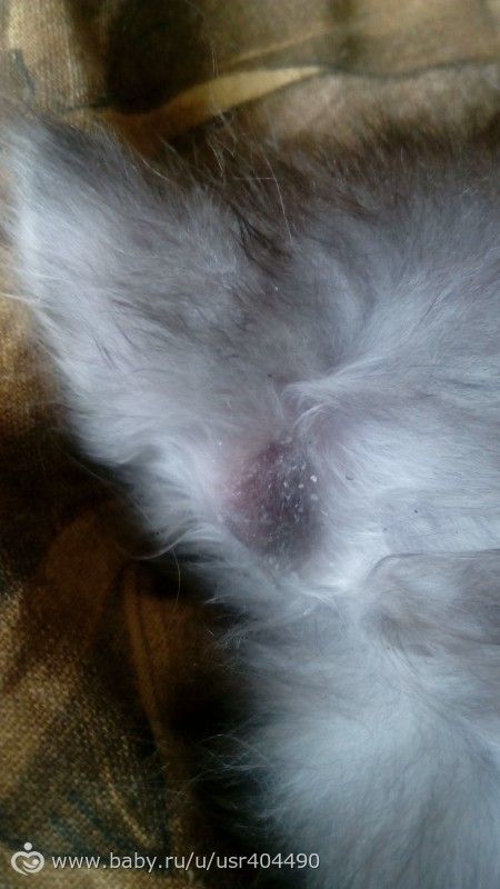дня 4 назад взяли с улицы котенка маленького.Заметила что у него за ушами какие то пятна. непонятно лишай это или нет? вроде не красный, корки нету.чешет иногда.может от блох расчесал. и на другом ухе тоже такое.
