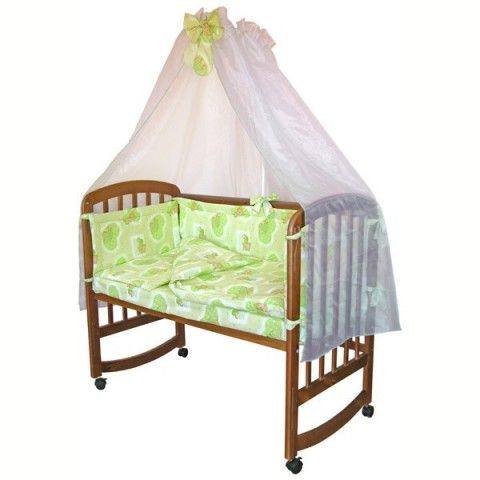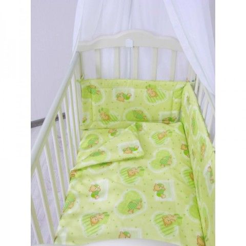 Самые обычные, зеленые с медведями. Одеяло, подушка, набор постельного и 4 бортика