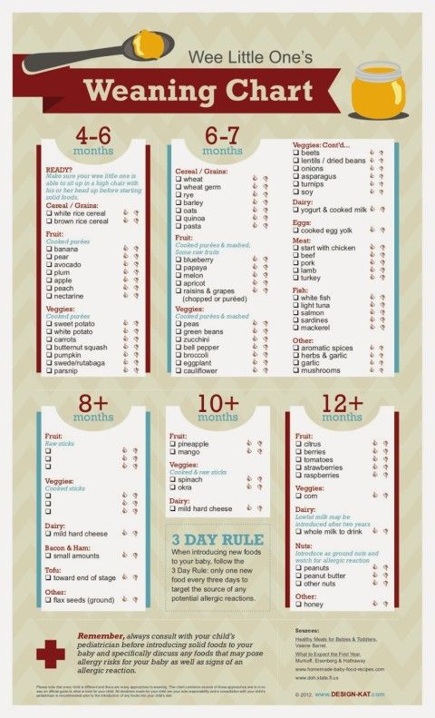 Тут идет по порядку от 4х месяцев. Нет здесь, естественно, типично наших продуктов, типа творога или кефира, но приблизительно можно подгадать или заменить на похожие. Если с английским не дрижите, то просто забивайте в гугл поиск по картинкам.
