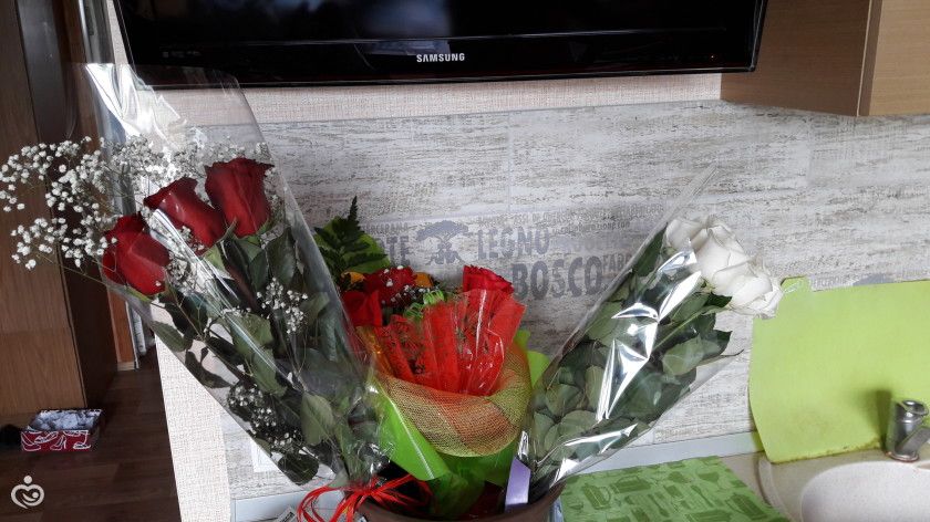 Потом заехали в магазин за продуктами к столу. Дома я быстренько настругала 3 салатика и, когда уже гости начали собираться, настряпала 2 пиццы. Не хотела наготавливать прям кучу всего с горячим. Решила сделать легкий перекус. Тем более, были только наши друзья 7 человек. Родственников мужа не было, слава Богу (нет, я, конечно, люблю свекров и семью брата мужа, но их очень много в нашей жизни, абсолютно ВСЕ праздники проходят в их компании, хочу я этого или нет). Вечер прошел шикарно! Цветы, поздравления, подарки-конвертики. Цветы пришлось ставить еще и в ведерко, т.к. у меня всего две вазы.