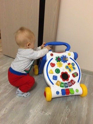 Мы купили 3в1 классная развивалка, она и а столик складывается и ходунками делается-т.е.ее толкать надо! Мы купили в 8 мес.