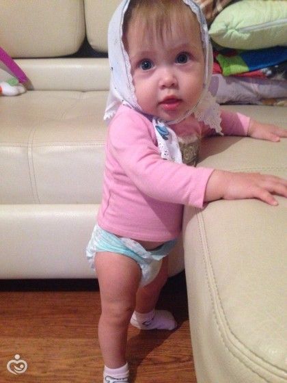 Встает везде, где есть на то возможность (опора), пытается ходить за ручки.