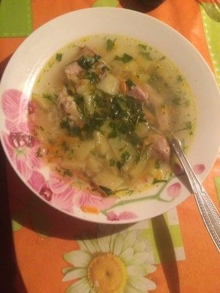 Какой суп? Просто, картошка, рис, морковка, лук и специи на гусином окорочке варила, но вкусный не реально))) я вчера вообще не была настроена на готовку вот решили обычный супец сварить))