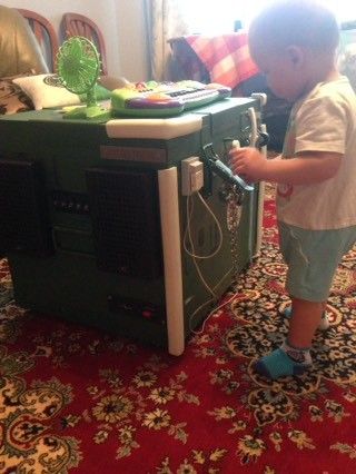 Колонки подключены к микрофону, можно говорить. А с ещё одной стороны лампочка включается по-настоящему с включателя и разетка с вилкой (муляж)