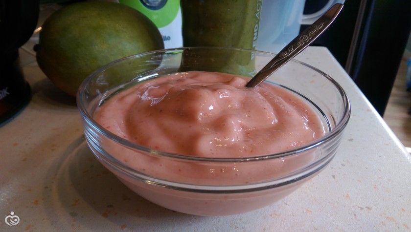 делаю клубничное мороженое, с бананом мороженым, клубникой, рисовым молоком и апельсиновым соком.