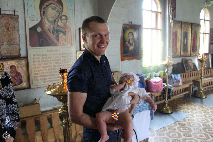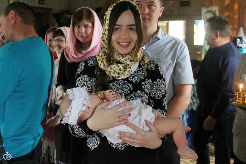 18 сентября мы по крестили доченьку! ну что сказать про этот день… утром доча проснулась в 6.00, а крестины были на 9.45… в итоге мы пришли и там было причащение и крещение началось только в 11.30… я была злая, так как доча орала на весь зал, потому что очень хотела спать! не спала с 6.00… держал ее на руках папа, почти все крещение, а я стаяла рядом и нервничала… моя мама вообще плакала, говорит ужасно жалко внучку… я сама хотела взять ее и убежать нафиг… батюшка заметно ускорился))доча орала не переставая пока ее не искупали))кто то говорит, что ее осветили и она из-за этого успокоилась, а по мне она просто привыкла, что после купания спать))пришлось одеть только половину костюмчика… кстати она сразу вырубилась на руках))вот тогда то я фоткать и начала))прилагаю фото))я в бежевом платке, в хомуте крестная, а красавчик это наш любимый папа!)))к концу крещения доча проснулась и уже лыбилась))муж мне очень помог, незаменимый помощник! и мамуля моя помогла))