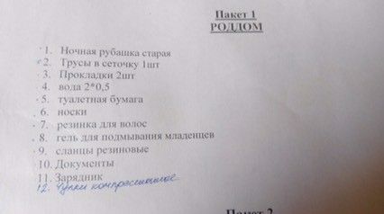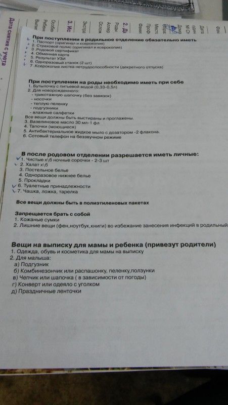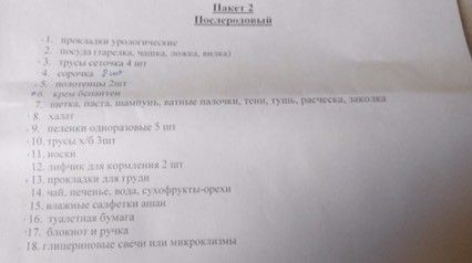 Уточняйте в своем роддоме.от себя скажу, вместо т бумаги брала салфетки влажные.и берите больше воды.лишней не будет.а в сам род зал берите бутылочки с соской которые.очень удобно лёжа пить.берите что то на перекус, после родов.пряники, печенье.кефир.после родов пейте больше горячего чая сладкого, слабость ужасная.не берите шлепки через палку, ужасно не удобные.дитю возьмите гель для умывания.а не мыло.удобно одной рукой мыть и нажимать