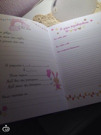— снимки узи— эмоции и переживания до рождения— информация о малыше (рост, вес при рождения и т.д)— выписка из роддома— папа, мама, бабушки, дедушки— отпечатки ручек и ножек— рост и вес по месяцам— информация о том, как и в каком порядке растут зубки— достижения малыша— первые звуки, слова, интересные фразы и выражения— крещение— и много много всего до 7 лет.