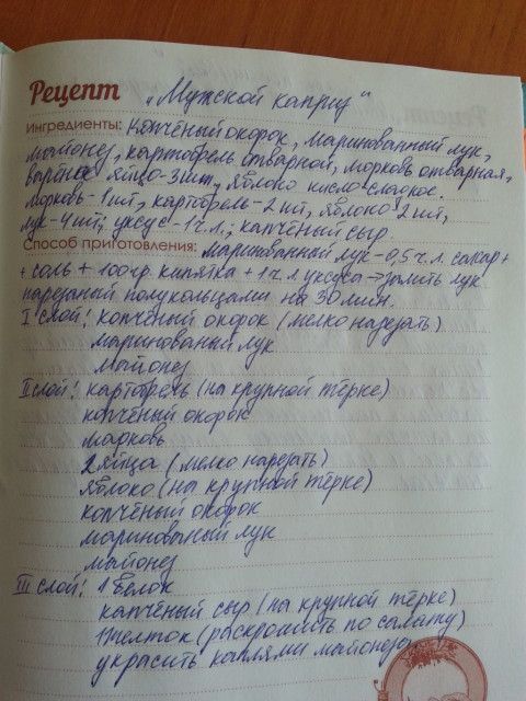 Знаю один очень сытный и вкусный салатик, называется "мужской каприз" слоями готовится)
