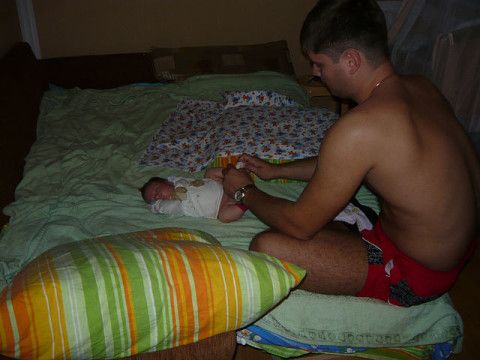 Купали вместе, даже пеленал сам. Пару раз в месяц часика на 2-3 убегала к подружке почирикать. Раз в месяц стабильно салон красоты на 4-5 часов уходила! (Дедушек и бабушек рядом нет).