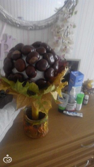 сегодня делали подделку в сад) Варя собирала листочки еще неделю назад, сушились они. потом каштаны. помыли посушили с ней) потом стали делать деревце) горшок сама изрисовала, ствол деревца тоже. помогала клеить. все приносила. потом устала. так что недоделали, завтра снова творчество будет осеннее)