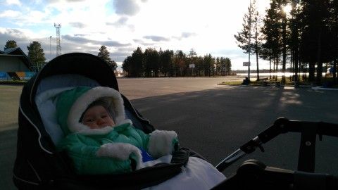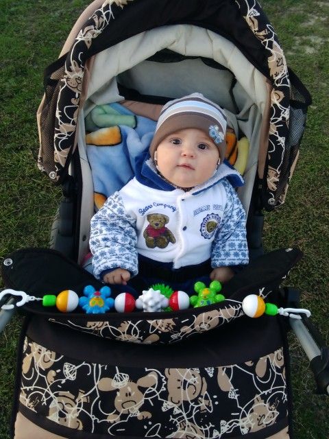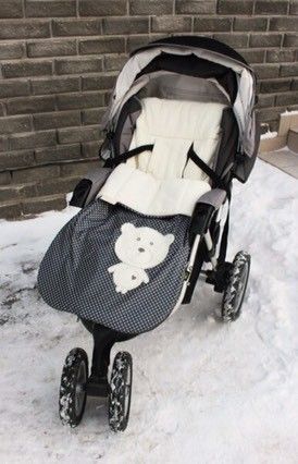 Мы плед стелим в коляску, одеваемся тепло в комбенезон, и защита от ветра от коляски, а на зиму купили комбинезон зимний и шапку