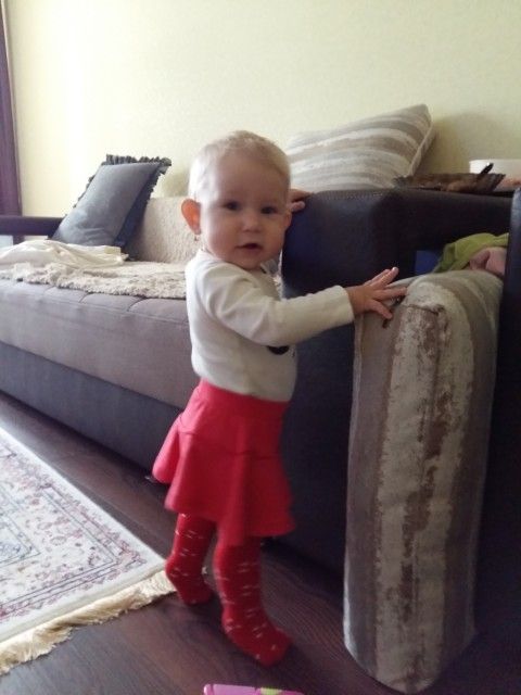 Она сама встает, держится ручками за кроватку и ходит по ней)