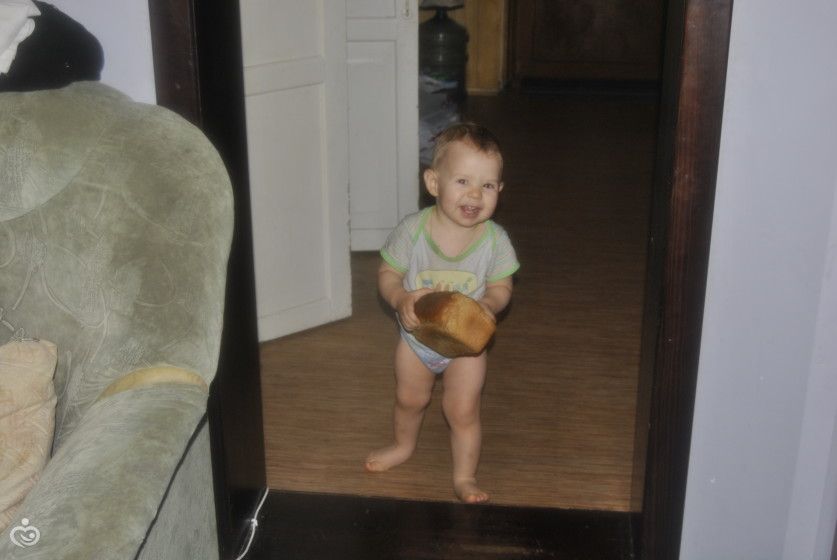 С утра папа уехал рано, Лева разоспался с утра аж до 8:10. Это долго! Папа завтракал самостоятельно, запаренной овсянкой. Спохватились, что нет хлеба. Старшенький сбегал. Лева отобрал у него булку и долго с ней ходил.