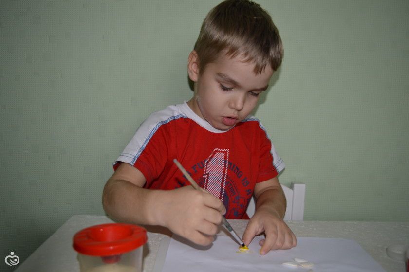 Сначала покрасил семечки гуашью, и положили их сохнуть.