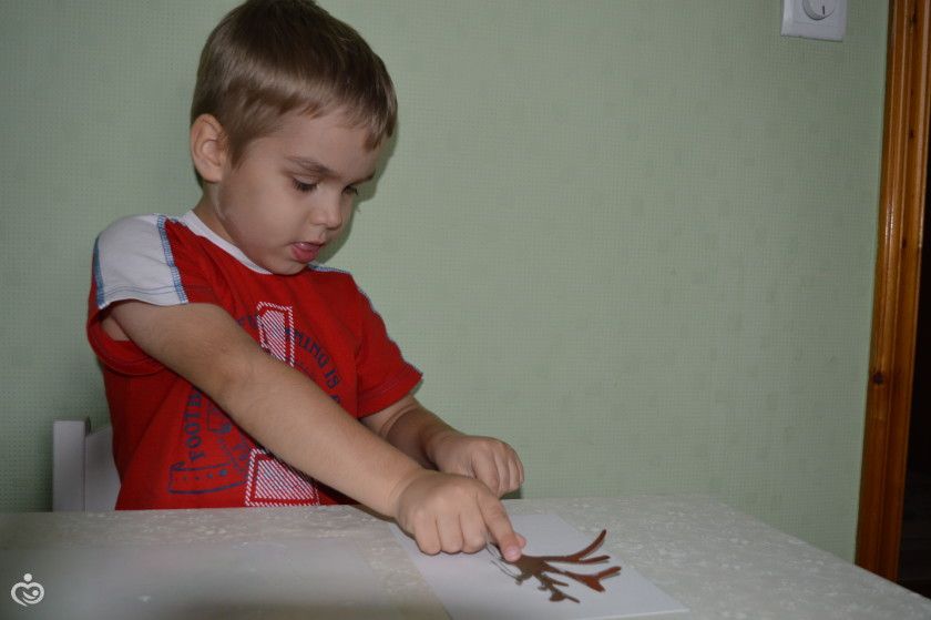 Затем наклеил ствол дерева (я заранее нарисовала и вырезала его из картона).