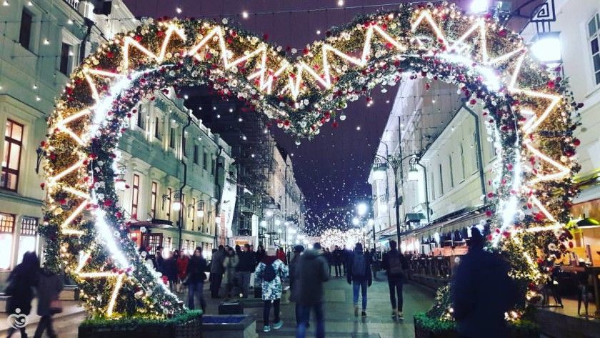 Невообразимый потолок из сверкающих огней и арок в виде светящихся сердец украшают всю Тверскую улицу!