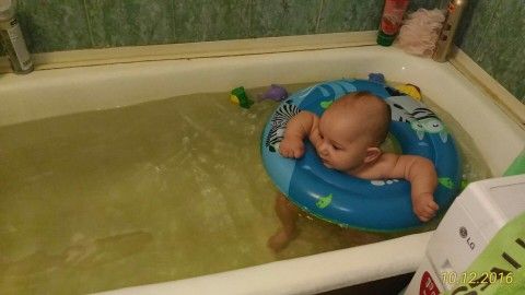 Месяц не плавала в ванной, только в душ по быстрому ее тоскали… Улыбалась, круг ручками держала не отпускала(боялась наверное, что заберем) подсолнух мой???