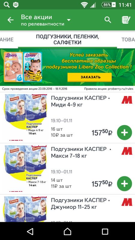 Я только акции просматриваю. Кстати на неделе обмануло меня приложение… цена в магазине оказалась иной...((( пробники через приложение никогда не брала, но нам либеро дали бесплатно в детском мире как-то. Вообще не в восторге((( фигня! Деть пописал и все это одним комком между ножек, неудобно. Хаггисы лучше.