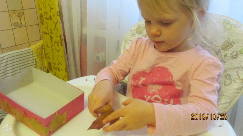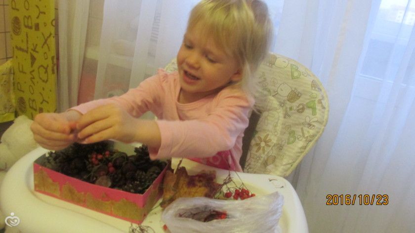 1. Поговорила с дочкой о том, как звери готовятся осенью к зиме, какие делают запасы! Делаем поделку «Запасы на зиму». Мы решили сделать осеннюю коробочку с запасами на зиму для белочки) Положили туда шишек, желудей и каштанов, а потом добавили еловых иголочек и ягод рябины. Алиса сначала на улице усердно собирала каштаны, а потом помогала мазать клеем и наклеивать листочки на стенки коробочки)