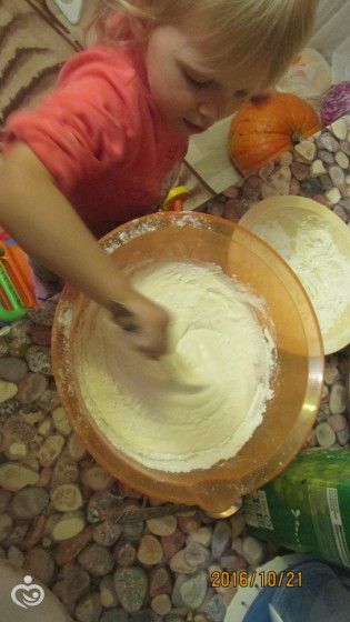 5. Печем осенний пирог! Алиса с большим удовольствием помогала засыпать муку в тесто и перемешивать его)