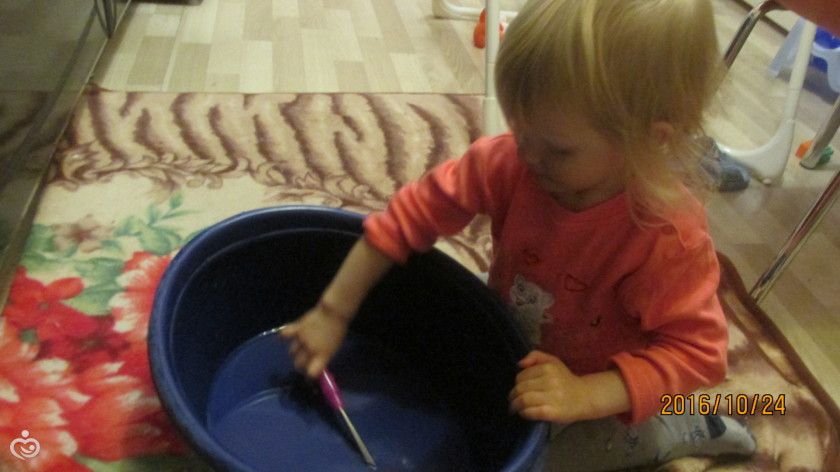 Вчера у нас как раз прошел дождь и мы планировали сегодня вовсю побегать по лужам, но, к сожалению, за ночь все лужи высохли и нам не удалось осуществить задуманное. К тому же, сегодня у нас ураганный ветер, поэтому прогулка была короткой и я даже не пофоткала Алису. Но вечером после проведения опыта с водой (о нем подробнее ниже) мы, все-таки поплескались вдоволь в тазике и решили, что это и будет выполнением нашего задания))))))