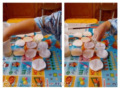 2. Сделали аппликацию из ватных дисков — осеннее деревце. Развела в двух стаканчиках желтый и красный цвета, вручила Арсению кисточку, пипетку и ватные диски. Пока сынок развлекался, раскрашивая ватные диски, я вырезала и приклеила к картону ствол нашего будущего дерева. Помогла Арсюше докрасить диски, подождали, пока они подсохнут и вместе приклеили их к нашей заготовке.