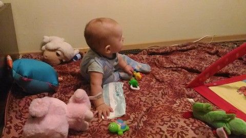 Выкладывайте на пол, сплсобствуйте ползанию и потом сам сядет постепенно. У нас так с 4 месяцев было. В 5 сел сам. С 4,5 на половинку попы и ножку садился как на фото.