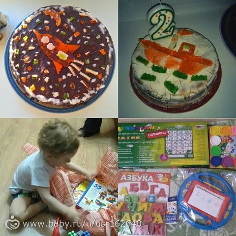 с ракетой — тортик для взрослых, с корабликом — персональный Витин торт :) Витя даже свечку задул, желание наверно загадал :)))) тётя подарила азбуку магнитную, карандашики восковые и руль с магнитным карандашом :))) а, и плюс еще печати с животными)))
