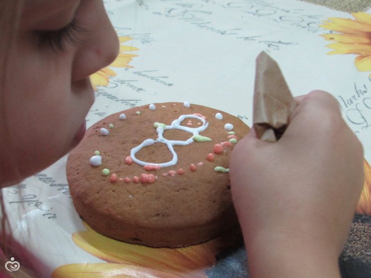 Участникам выдали готовые имбирные пряники, кулечки с разноцветной глазурью, и пошло творчество. Мы с Аней делали очень простые рисунки.