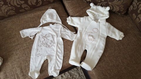 Мы купили 68-86 комбез бежевый. В нем и будем выписывать. Рукава внутрь заправляю, а в ножки как посоветовали, полотенце рулетиком свернуть или одеяльце тонкое.