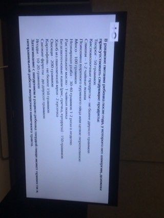 Завтрак каша ( гречка, кукуруза, овсянка) фруктовое пюре, обед мясо 1 банка овощи ( картоха, ц.капуста, броколи, морковь, лук) полдник-ужин кашу и иногда фрукт или овощ.пюре с кашкой, на ночь смесь 230 мл кормлю в течении дня через каждые 5 часов, даю в перекусы тоже фрукты в немблере, бублик, печенье детское.